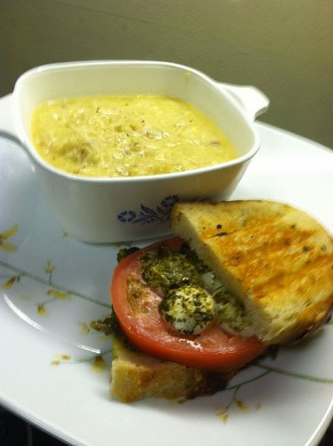 As I'm sure everyone can tell - I have a special place in my heart for the caprese salad, and thus I try to find anyway to eat it... every day. So I made a half caprese sandwich on sourdough with fresh basil and mozarella and balsamic reduction and grilled it on the George Foreman which makes a suitable substitute for a panini press. For Jenn's sandwich I made a slight variation by just using pesto, mozarello, and tomato.